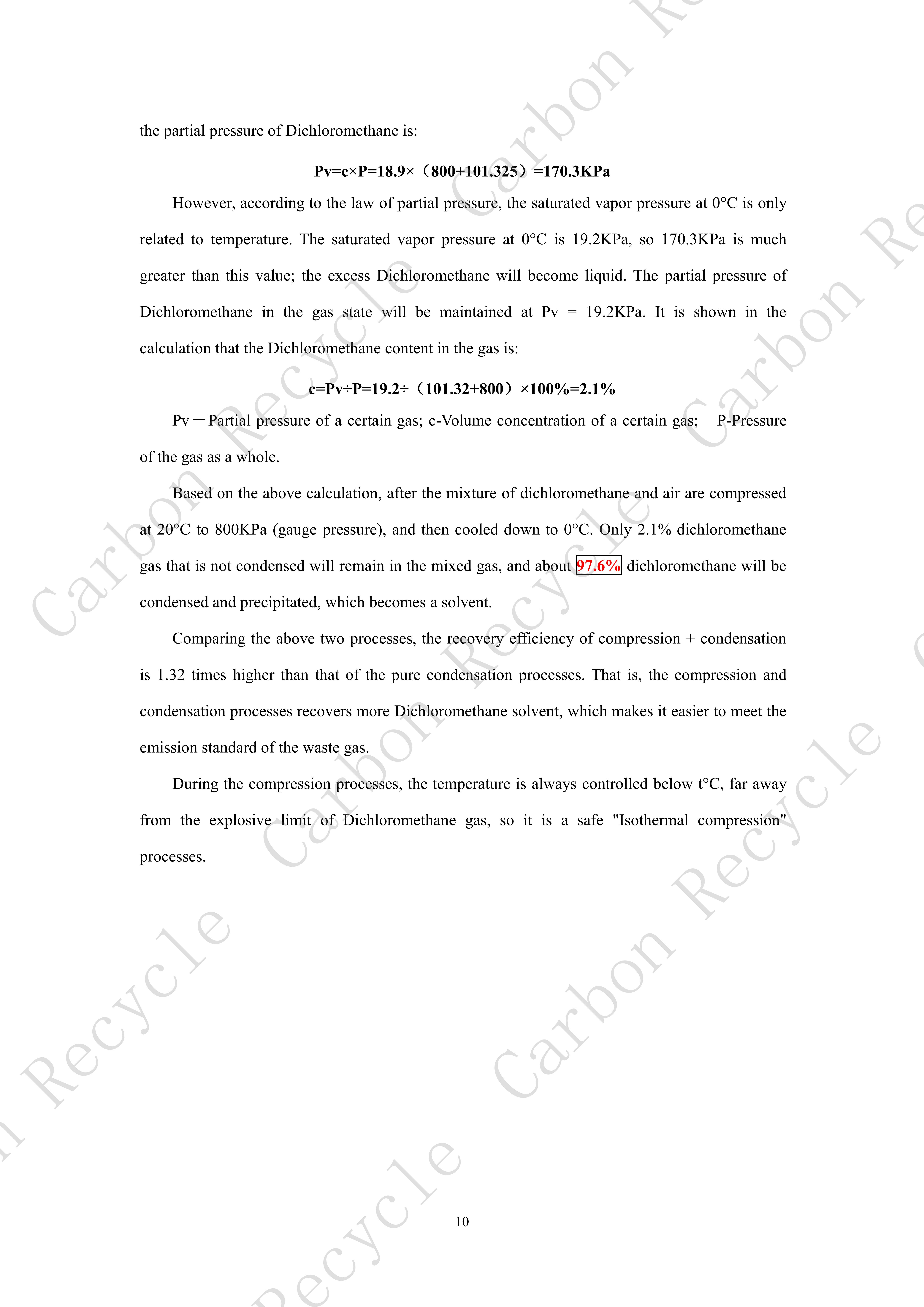 In the chemical production processes, a vacuum pump is usually used to collect VOCs generated in a reactor or other form of reaction device in vacuuming method. According to Dalton's law, the partial vapor pressure of various gases in the mixed gas is equal to the percentage of the gas by volume. Taking the mixture of Dichloromethane and air as an example, the saturated vapor pressure of Dichloromethane at 20°C is 47.39KPa, and the proportion of Dichloromethane in the mixed gas is about 46.8%. Considering the insignificant change in gas pressure before and after the condenser, the temperature of the mixed gas is lowered to 0°C. The saturated vapor pressure of Dichloromethane at 0℃ is 19.2KPa, and the proportion of Dichloromethane in the mixed gas is about 18.9%.