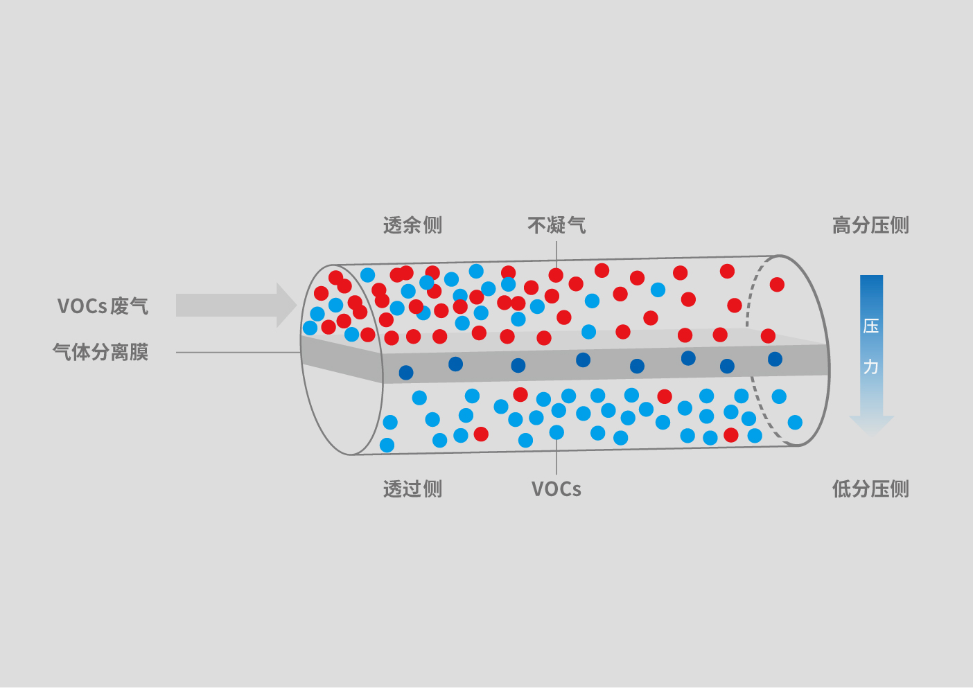 經(jīng)過以下3個(gè)步驟,由膜的高分壓側(cè)透過膜到達(dá)低分壓側(cè):①氣體吸附溶解在膜的高分壓側(cè);②在濃度差的作用下,溶解在高分壓側(cè)膜表面的氣體向低分壓側(cè)表面擴(kuò)散;③到達(dá)低分壓側(cè)膜表面的氣體從膜體中解吸。