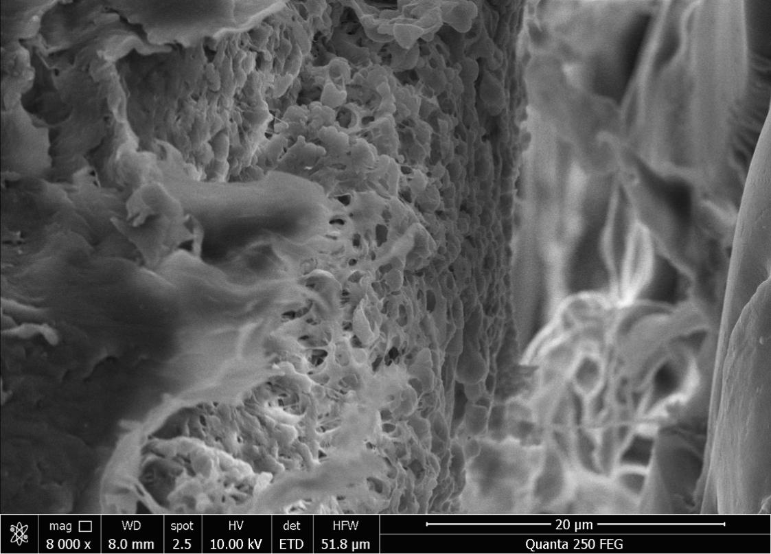 圖三 電鏡下氣體分離膜的三層結(jié)構(gòu)(照片由南京碳環(huán)生物質(zhì)能源有限公司提供)