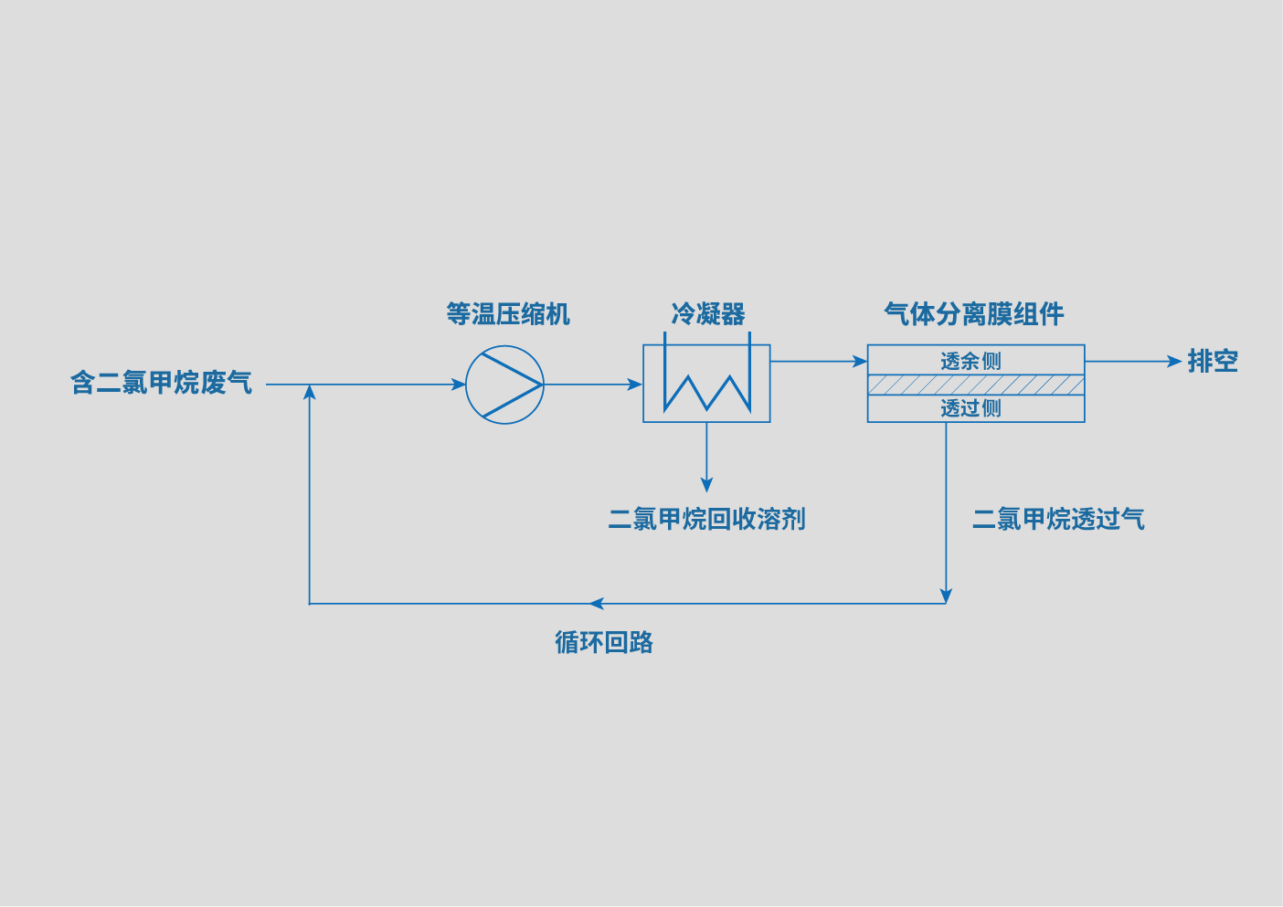 經(jīng)壓縮后的二氯甲烷有機(jī)廢氣進(jìn)入冷凝器,氣體中的一部分二氯甲烷被冷凝下來,回收后的二氯甲烷溶液可以再次使用。而未冷凝的二氯甲烷氣體進(jìn)入氣體分離膜組件,在壓力差的推動下,二氯甲烷透過膜,透余氣為脫除二氯甲烷后的氣體,通常為空氣。透過氣中富含二氯甲烷有機(jī)氣體,該氣體循環(huán)至壓縮機(jī)的進(jìn)口進(jìn)行復(fù)疊處理。由于二氯甲烷在循環(huán)回路中的濃度逐步上升,壓縮后進(jìn)入冷凝器的二氯甲烷達(dá)到凝結(jié)濃度,二氯甲烷又被冷凝下來,成為可以被利用的液態(tài)二氯甲烷溶劑。
