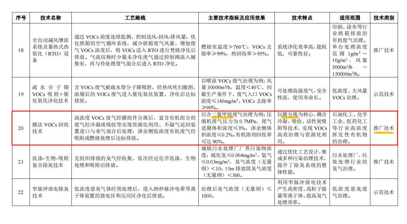 近日,國(guó)家生態(tài)環(huán)境部發(fā)布關(guān)于2021年《國(guó)家先進(jìn)污染防治技術(shù)目錄(大氣污染防治、噪聲與振動(dòng)控制領(lǐng)域)》(公示稿)的公示,文件中序號(hào)20推薦的污染防治技術(shù)為:壓縮冷凝+膜+吸附工藝,源頭回收VOCs 。特別是二氯甲烷類有機(jī)溶劑蒸汽的源頭回收和達(dá)標(biāo)排放。