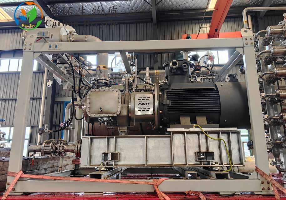 壓縮單元選用的無油單螺桿壓縮機,系統(tǒng)采用去離子水潤滑,潔凈、無油,機頭的容積效率(Max)≥95%,與介質(zhì)接觸的殼體、轉(zhuǎn)子、軸承座、蓋板、緊固螺栓等金屬部件均采用316L不銹鋼材料制造。螺桿及星輪片使用SINUMERIK數(shù)控加工軟件,由五軸聯(lián)動加工中心加工制造,殼體由臥式加工中心加工。且使用三坐標(biāo)測量儀進行形位公差檢測,確保加工精度。螺桿曲面輪廓度為±0.01mm,粗糙度,螺桿及星輪不平衡度優(yōu)于G1級。壓縮機的嚙合副加工精度高,磨損小,振動小,噪音低。